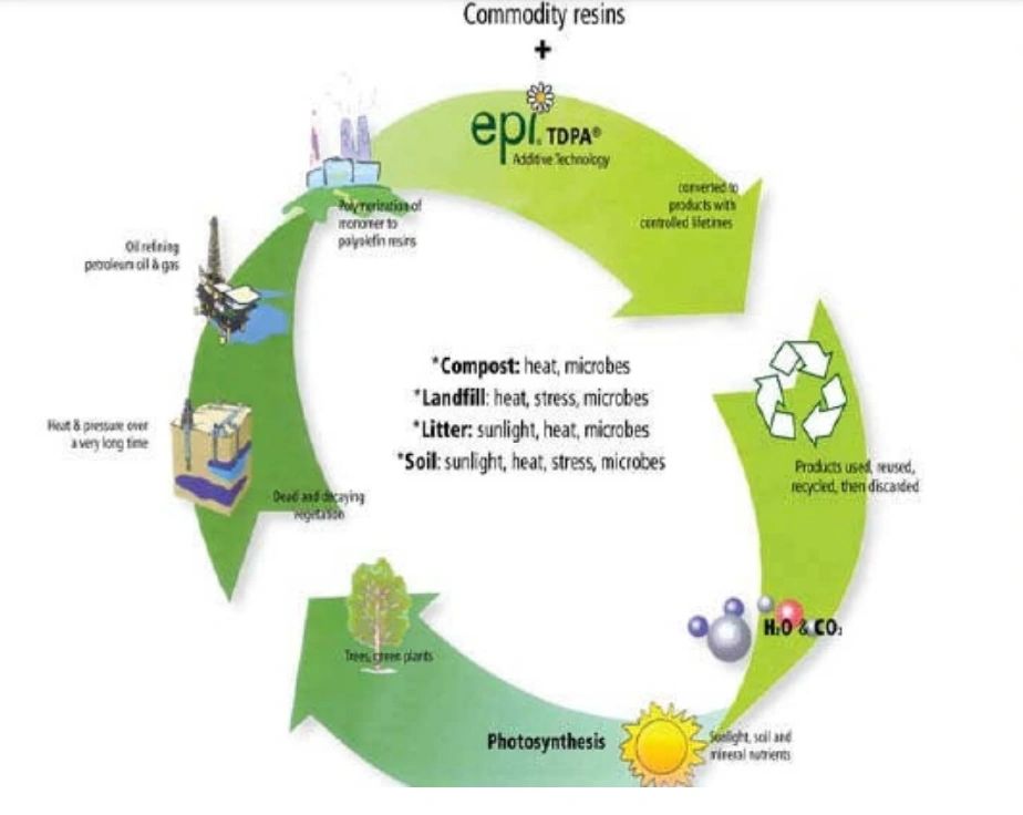 Oxo-biodegradation is recognized as a two-stage process. Oxo-biodegradable plastics do not simply disintegrate into smaller pieces of plastic that pollute the environment. Oxo-biodegradable plastics use a technology that is based on the well understood but slow reaction of conventional plastics with the oxygen in the air. The incorporation of Totally Degradable Plastic Additives (TDPA) accelerates this reaction in a very controlled way. This causes the products to physically disintegrate in an acceptable time period when they are exposed to air and sunlight or heat.